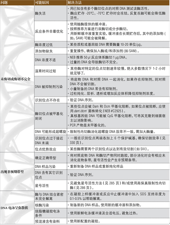 ? 如果對(duì)照 DNA 能夠被切割而實(shí)驗(yàn)中的底物 DNA 不能,可以將這兩種 DNA 混合在一起再進(jìn)行酶切,以檢測(cè)實(shí)驗(yàn)用的底物 DNA 中是否存在抑制反應(yīng)的物質(zhì)。如果確實(shí)存在某種抑制因子(通常為鹽、EDTA 或酚),則混合之后對(duì)照 DNA 也不能被切割。
