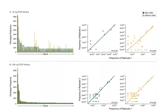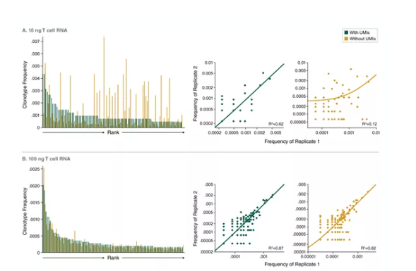 使用唯一分子標簽序列(UMI)實現(xiàn)克隆型的精準檢測。在有或沒有 UMI 情況下,比較小鼠 TCR 克隆型頻率。根據(jù)有 UMI 的測序結果,對前 100 個高表達克隆型進行排序。在有或沒有 UMI 情況下,重復建庫,克隆型頻率重疊繪制于圖中。每個條形或圓點代表一個克隆,該克隆經(jīng)過總讀長分析或使用 UMI 過濾。使用 UMI 可對原始樣本中的起始 RNA 分子進行絕對定量。當將克隆按照富集度從高到底進行排序,沒有 UMI 的數(shù)據(jù)會導致 PCR 或測序擴增的偏差,從而誤導樣本中克隆型頻率的分析。UMI 的使用通過對起始樣本中 RNA 的絕對定量來校正偏差。使用 UMI 也可以在重復本之間實現(xiàn)更好的相關性,尤其是起始量較低時。各個文庫向下抽樣 500,000 reads。