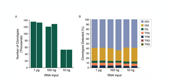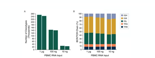 使用 NEBNext 免疫測序試劑盒(人),能夠在同一管中制備人 BCR 和 TCR 文庫。分別使用 1 μg、100 ng 和 10 ng 人 PBMC 總 RNA(Takara Bio #636592)制備人 BCR+TCR 文庫,每個起始量都做有平行實驗。所有文庫向下抽樣 950,000 reads。使用 pRESTO 工具完成 reads 過濾、序列組裝和基于 UMIs 組成共有序列。使用 MiGMAP 鑒別 V、D 和 J 區(qū)域。圖(A)表示每個人類 PBMC 總 RNA 起始樣本檢測到的克隆型數(shù)量。圖(B)表示各文庫中 B 細胞鏈和 T 細胞鏈所占百分比。