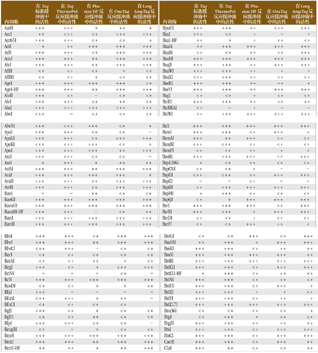 通常,PCR 反應(yīng)后還要對產(chǎn)物進(jìn)行酶切才能進(jìn)行下一步工作。為了方便起見,可以將內(nèi)切酶直接加到 PCR 反應(yīng)產(chǎn)物中,而省略純化 PCR 產(chǎn)物的步驟。下表歸納了在 Taq、Phusion*、OneTaq 和 LongAmpTaq PCR 產(chǎn)物混合物中各種限制性內(nèi)切酶的酶切活性。50 μl 反應(yīng)體系中,將 5 單位內(nèi)切酶加入到 PCR 反應(yīng)產(chǎn)物中,在適當(dāng)?shù)臏囟认路磻?yīng) 1 小時(shí),凝膠電泳分析酶活性。PCR 反應(yīng)產(chǎn)物中包括:1X ThermoPol 反應(yīng)緩沖液、標(biāo)準(zhǔn) Taq 反應(yīng)緩沖液、Phusion HF 反應(yīng)緩沖液、OneTaq 標(biāo)準(zhǔn)反應(yīng)緩沖液或 LongAmpTaq 反應(yīng)緩沖液,含 dNTPs(終濃度為 200 μM)、1 μg DNA 和 1 單位 Taq DNA 聚合酶。