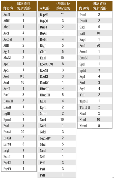 0.13 單位的酶量;表中標注有“++/+” 的酶是具有中等活性的延時內(nèi)切酶,16 小時完全酶切