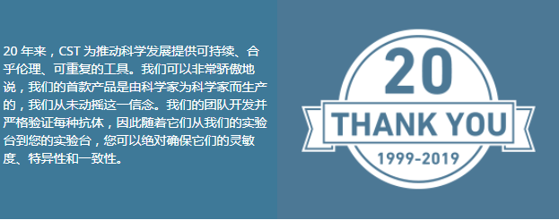 CST是一家由科學(xué)家創(chuàng)立的私營家族公司,致力于提供全球最高品質(zhì)的創(chuàng)新研究和診斷產(chǎn)品,加速生物學(xué)認(rèn)知以及實現(xiàn)個體化醫(yī)療。其高質(zhì)量的產(chǎn)品和專業(yè)的研發(fā)精神已被全球客戶推崇為“細(xì)胞信號研究的金標(biāo)準(zhǔn)”和‘最佳抗體。CST 的可持續(xù)發(fā)展計劃在生物制藥行業(yè)受到普遍認(rèn)可。